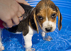 这是最为直接而且最为治本的方法了,一般狗狗异味是和不洗澡挂钩的。在狗狗幼小时期,由于狗狗的进食和排便比较没经验,造成幼狗时期的特有臭味,成年后狗狗活动幅度加大,加上日常活动也会造成臭味。有条件的可以做到一天一洗,达不到的也要至少三、四天洗一次。洗澡水选用温水,夏天时狗狗怕热,可以用凉水直接给狗狗洗澡(那样它会很开心)。洗澡时可使用狗狗沐浴露,但用我们日常用的沐浴露也可以达到相同效果。