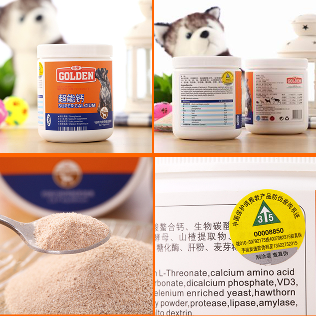 2、可以购买犬专用钙粉,但一定要注意钙产品有没有钙磷配方,这个配方对于狗狗对营养的吸收特别重要。关于服用量,一般都会有说明是按照体重计算服用剂量的。建议大家用谷登超能钙给狗狗进行补钙,里面含有钙磷配方易吸收,钙源用鲨鱼软骨粉,营养比较充足,对于狗狗补钙,利于身体成长方面较为理想。
