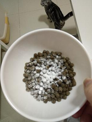 所含的菌类我就不一一说明了,反正挺多的。还能改善口臭。双向调节大便,真不错。倒在猫粮里,小贝有点迫不及待了。 小贝看到白白的粉末,先是愣了一下,然后没有任何顾虑的开吃。 不一会儿,上面的一层就吃掉了。吃完的效果今天回家观察便便后,再更新。上萌照!