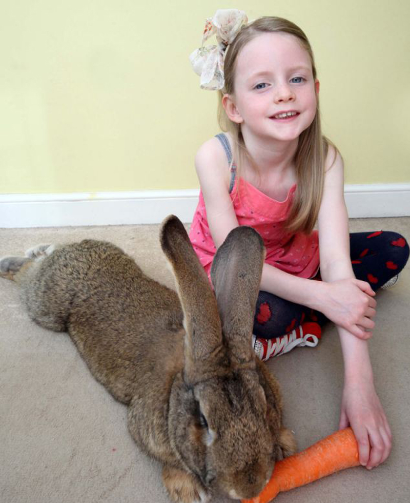 据英国《镜报》22日报道,英国有一只体型巨大的宠物兔子,主人安妮特爱德华兹每年喂养它就要花费2500英镑(约合人民币2.6万元),它每年吃掉的红萝卜达4000根,被吉尼斯世界纪录认定为世界上最大的兔子。据悉,这只宠物兔子名叫“大流士”,体长4英尺4英寸(约为1.3米),几乎和照片中6岁的小女孩米娅(Mia)一样高。兔子的主人是来自于英国62岁的安妮特爱德华兹,据她介绍,每年在这只宠物兔子身上的花费达2500英镑,它每天要吃12根红萝卜、一些卷心菜、苹果以及两大碗兔食。安妮特说:“‘大流士’永远不会停止进食。它很贪婪,我必须看着它。”她称自己很注意控制兔子的饮食,“我让大流士尽可能多地吃它最喜欢的干草,但它总想要更多食物。我必须看好胡萝卜,它非常喜欢胡萝卜,特别是萝卜的绿色顶部。”