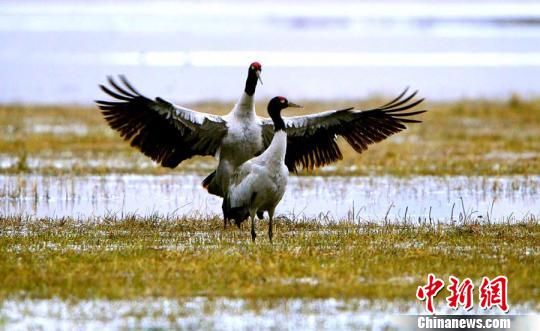 每年的3月底至4月初,甘肃甘南尕海湿地就迎来越冬地迁回的夏侯鸟,据甘肃尕海则岔国家保护区工作人员统计,今年的尕海湿地迎来30多对黑颈鹤集体度“蜜月”。