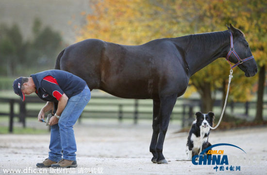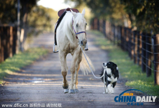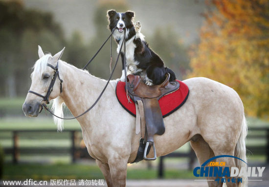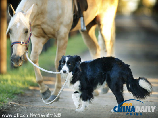 今年1岁的边境牧羊犬黑肯可以帮助主人杰弗里斯做许多事情,更令人惊叹的是黑肯“御马有方”。据悉,杰弗里斯是一名马术卓越的骑手,他曾在悉尼奥运会开幕式上作为“孤独骑士”出场。而杰弗里斯策马扬鞭就是开幕式开场的信号。作为明星主人的爱犬,黑肯也不示弱。身为主人好帮手的黑肯可以带着马散步,还可以帮助主人取来所需要的物品。不过,黑肯最令人称奇的是,黑肯可以骑马。杰弗里斯说:“黑肯是一只非常有才华的狗。他是我的秘书,可以替我做许多事。”
