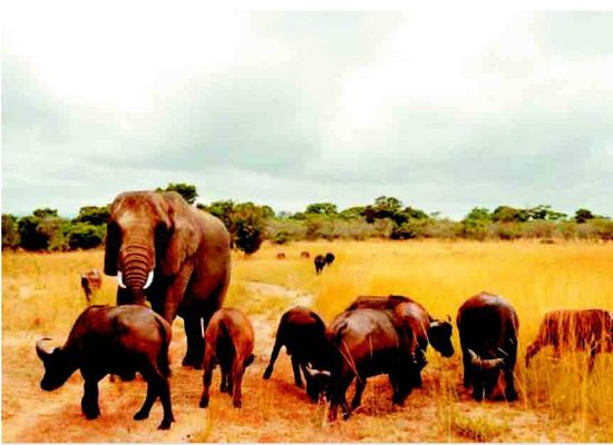 西方有句谚语说,大象永远不会忘记。可是津巴布韦的一头母象似乎忘了自己的大象身份,以为自己是野牛,与野牛结伴闲逛游戏,并保护它们免受欺负。这头大象名叫“努祖”,现年46岁。自上个世纪70年代它的父母遭猎杀后,“努祖”就入住津巴布韦“伊米尔黑犀牛和野生动物保护区”。当时,保护区内体型较大的动物只有一群野牛,保护区创建者诺曼·特拉弗斯就让“努祖”和一头公象与牛群共同生活。当公象去世时,“努祖”已经习惯于混迹在野牛群中。即便后来保护区内有了象群,它也不愿意归队,宁愿担当牛群统领,担负起保护者的角色。有一次,一头小公牛遇袭受伤,“努祖”亦步亦趋,护着小牛进入安全地带,免受再次袭击。英国《每日邮报》22日援引保护区所有者朱迪的话报道:“‘努祖’是整个保护区的‘女王’,但它喜欢和野牛们一起消磨时光。我们曾经多次尝试让它融入保护区内的象群,但它很满足于现状。”“努祖”和野牛群建立起一套沟通方式,相互之间默契十足,但它从不回应保护区内的象群,也许已经听不懂象群的“话语”。