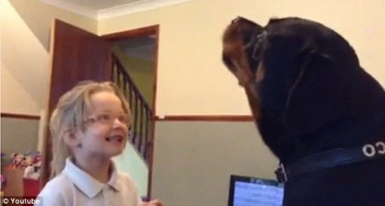 他们俩先唱了一段《咩,咩,黑绵羊》,之后又一起演绎了《一闪一闪小星星》。一只罗威纳犬坐在小女孩面前,伴随着这首儿童最受欢迎儿歌的旋律,高亢地吼着。