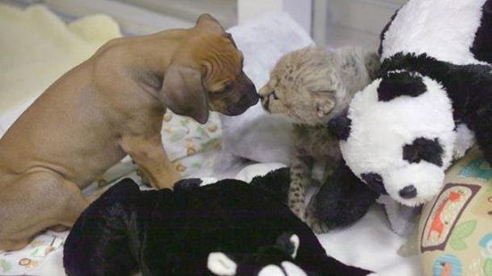 据外媒报道,美国一家动物园中,一只被母亲弃养的小猎豹与一只小狗意外成了一对好朋友,它们一起进食玩耍,宛如亲生“姐弟”。