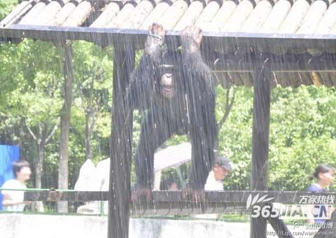 黑猩猩的屋子里,工作人员给它喷水降温。