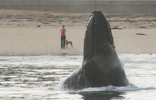 这只跟主人散步的小狗,似乎被突然出现的座头鲸吓了一跳