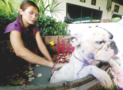 一名泰国按摩师在一家名为“狗休假及矿泉疗养村”里为一只洗花瓣浴的狗做按摩,以使这些宠物狗缓解压力和治病。
