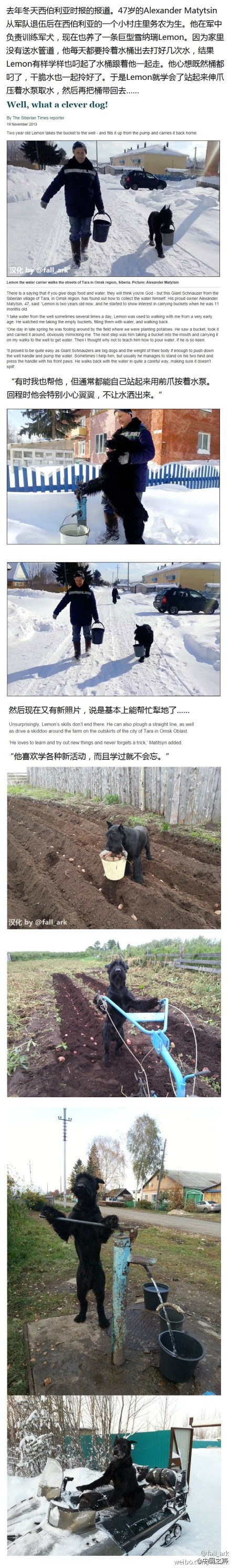 西伯利亚一位农夫家的巨型雪纳瑞犬Lemon,学会了帮忙干农活。去年冬天的时候还只是会提起水桶一起去打水,今年似乎已经学会推着犁来犁地了……看这样子以后还要再进化……