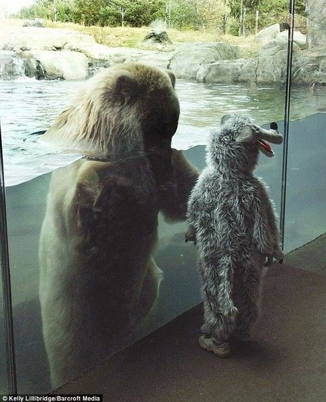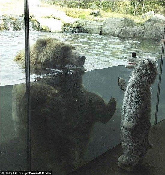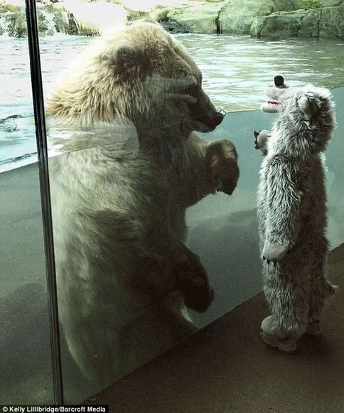 虽然大多数人去动物园时是不敢近距离盯着熊看的,但是照片中的这位勇敢的小男孩却身着北极熊服装,近距离参观了明尼苏达动物园(Minnesota Zoo)中的北极熊。而且,当北极熊从水中探出头来观察这个外形与自己相似的男孩时,小男孩没有表现出丝毫的害怕。