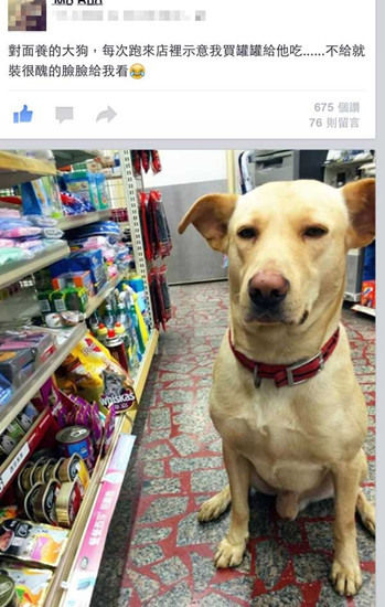 简小姐表示,上班时间,大黄狗就坐在罐头区旁边跟她遥遥相望,露出一脸怪表情,默默用眼神施压,示意她买罐头给它吃,而且还会用视线暗示要最大罐的那种,让她颇感压力也哭笑不得。