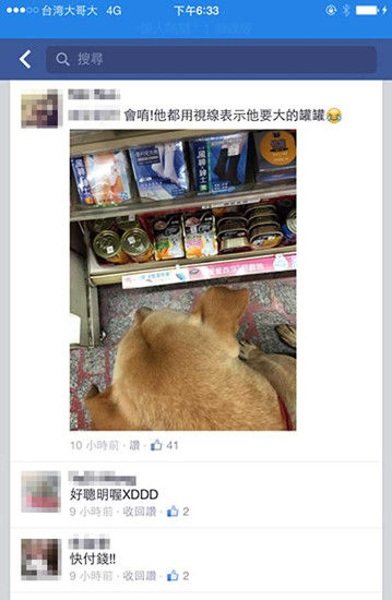 简小姐把照片po上网,引来网友纷纷笑称:“表情也太搞笑了!”“好聪明的狗狗”“有狗陪上班也不错啊~”,甚至有人催她“快付钱!”也有网友觉得一个罐头换一个保镖犬,很合理。