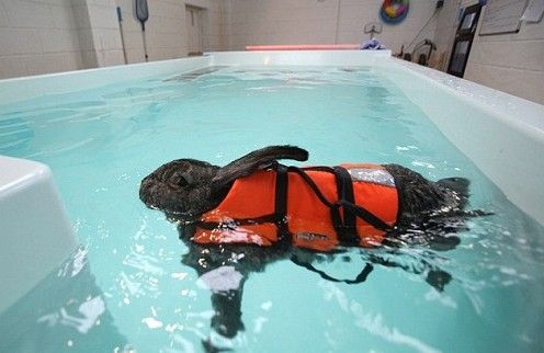 据外媒报道,在人们的印象中,兔子这种毛绒绒的小动物总是在草地上蹦来蹦去,很少有人会把它们和水池联系在一起,更不会有人想到让它们游泳。然而英国一只宠物兔却成了游泳池的常客。原来,这只宠物兔患有关节炎,而让它游泳正是为了帮它进行治疗。