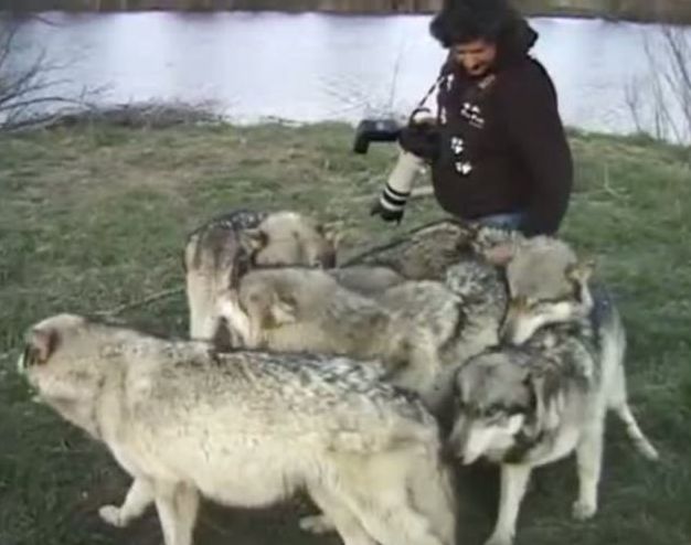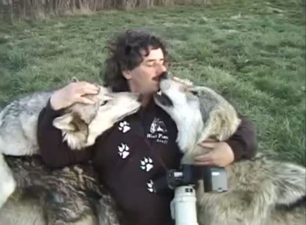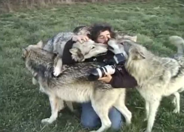 照片中,五匹灰狼依偎在摄影师身旁,与摄影师亲吻、拥抱。它们不时在地上翻滚,玩耍嬉戏,相互舔吻,相互轻抚额头,隆斯也不禁轻抚它们的脑袋。毫无畏惧的动物爱好者也加入了这场“爱的仪式”,似乎都快要忘却了自己的本职工作。