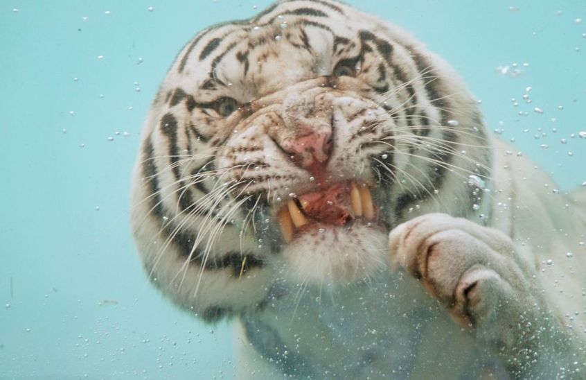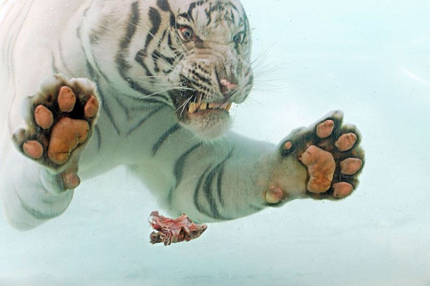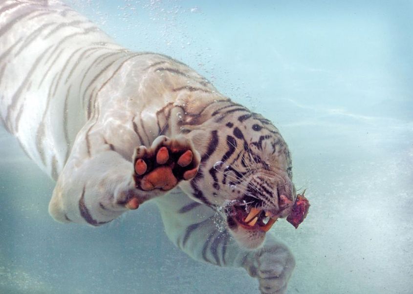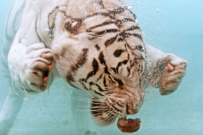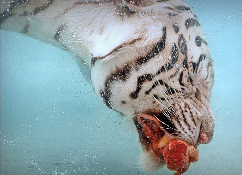 图片中的老虎名为克什米尔(Kashmir),属濒临灭绝的孟加拉白虎,目前生活在加利福尼亚北部的六旗动物园(Six Flags Animal Park),表演这种水下潜水捕食节目。随着驯兽师将生肉丢进巨大的透明水箱中,克什米尔跃入水中,克里斯蒂•哈伯(Kristi Harper)举起相机,瞬时捕捉下这些画面。她说:“我很喜欢这种老虎潜水的节目,尤其是它捕到肉之后的面部表情,大家并不十分害怕这一表演,但是总会被老虎面部凶残的表情所吓到。”