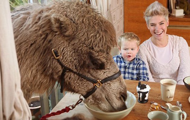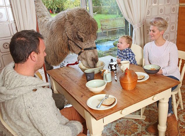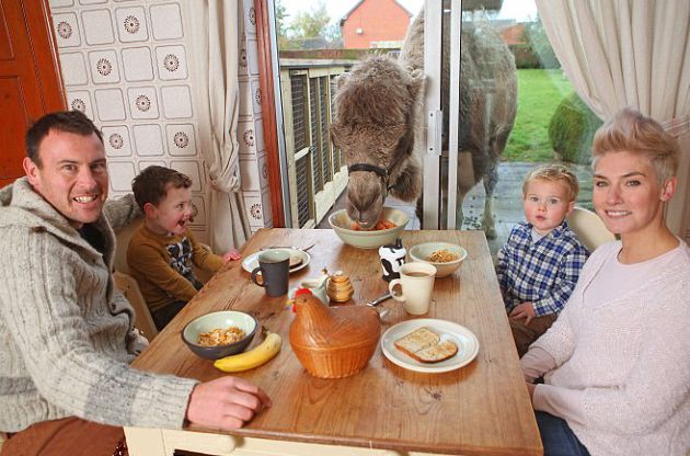 你有宠物吗?你和你的萌宠一起吃过早餐吗?据英国《每日邮报》报道,英国斯塔福德郡的安德森•狄克逊一家就与他们家6岁的双峰驼“乔”一起共进早餐。