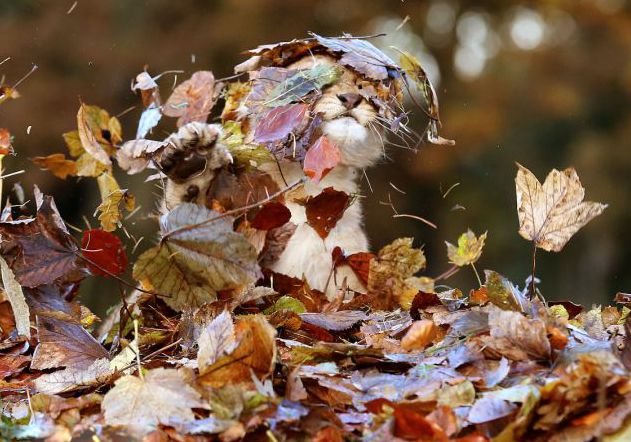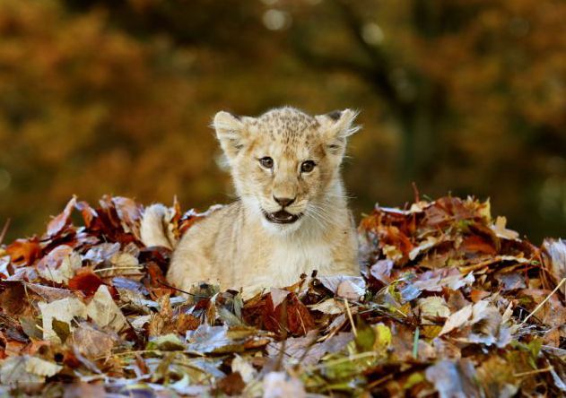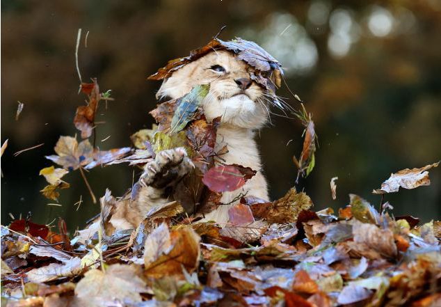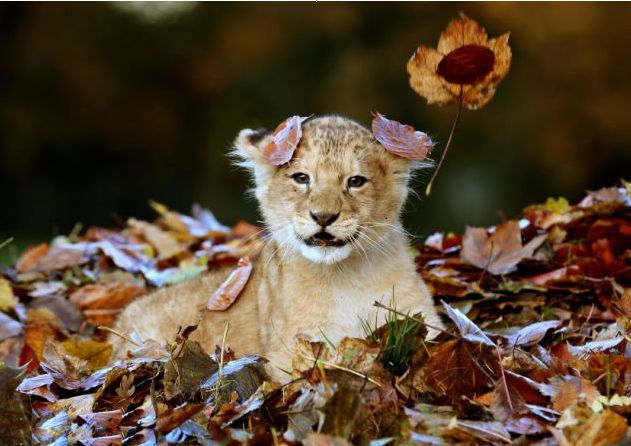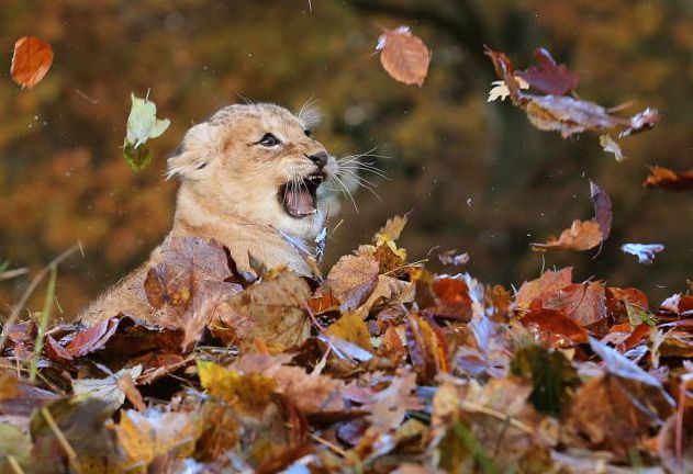 这只小狮子名叫“卡莉丝”(Karis),出生仅11周。它的饲养员布赖恩•里德(Brian Reid)看到工人们扫起来的成堆的落叶时,觉得这个“小朋友”可能会喜欢,便在它的围场里放了一些。结果证明这只小狮子跟小孩儿一样,它立刻跳进落叶堆里玩的不亦乐乎,甚至连头上也“挂”着几片叶子。