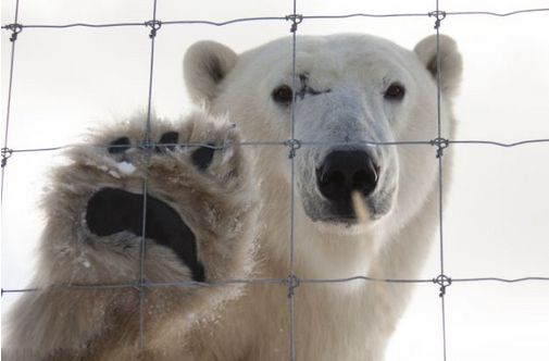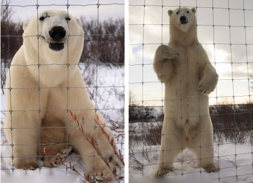 这名女摄影师名叫莱•本娜(Dafna Ben Nun),她是在位于加拿大克勒费尔德的戴蒙德湖基地(Dymond Lake Lodge )进行拍摄的,这里是少有的几个可以近距离接触这些危险动物的地方。她说,一开始这只北极熊很好奇想弄清她在干什么,但当它太活跃时管理员不得不吓退它。这只北极熊甚至一度伸出前爪想隔着栅栏与本娜玩“格斗”。