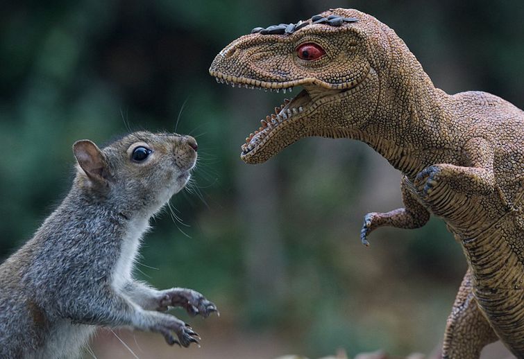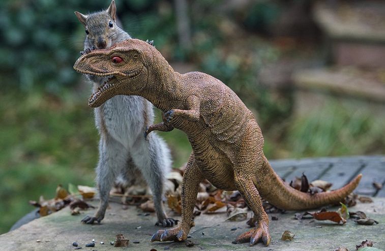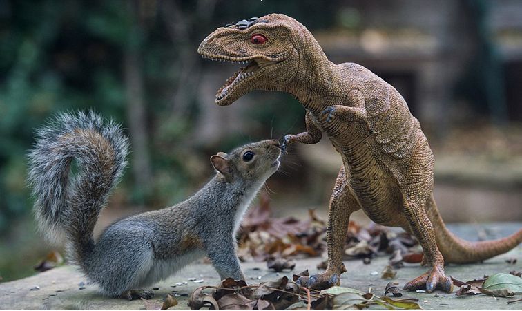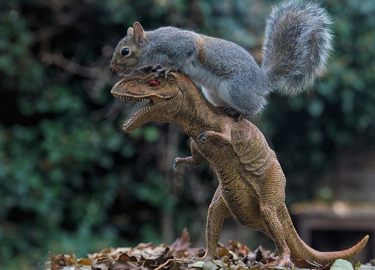 从照片中可以看到,在这一历史性的较量中,小松鼠显得非常勇敢,它不知道自己面对的是一个可怕的对手,还想“解决掉”它面前的敌人呢,所以它爬到霸王龙的背上来宣告它的胜利。松鼠一向以擅长利用它坚固锋利的爪子进行捕食和攀爬著称,它在这一打斗里将此优点发挥得淋漓尽致。