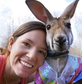 女主人和穿着漂亮衣服的袋鼠Boomeroo在一起合影